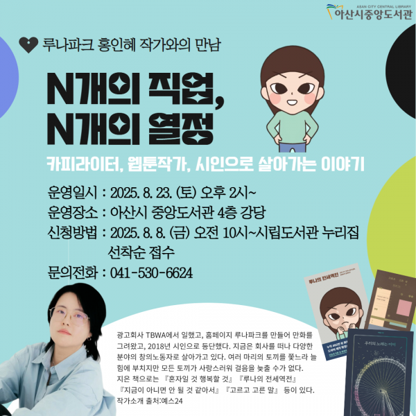 [충청25시] 아산시립도서관이 23일 오후 2시, 중앙도서관에서 청년 대상 인문학 특강 ‘루나파크 홍인혜 작가와의 만남-N개의 직업, N개의 열정’을 운영한다.