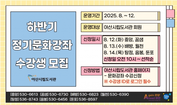 수강 신청은 12일 오전 10시부터 아산시립도서관 누리집에서 선착순으로 진행되며 도서관별 신청 일자가 다르므로 미리 확인해야 한다.