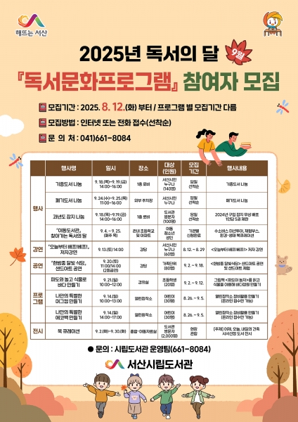 [충청25시] 충남 서산시는 독서의 달 9월을 맞아 시립도서관에서 다채로운 독서 문화 프로그램을 운영한다고 7일 밝혔다.