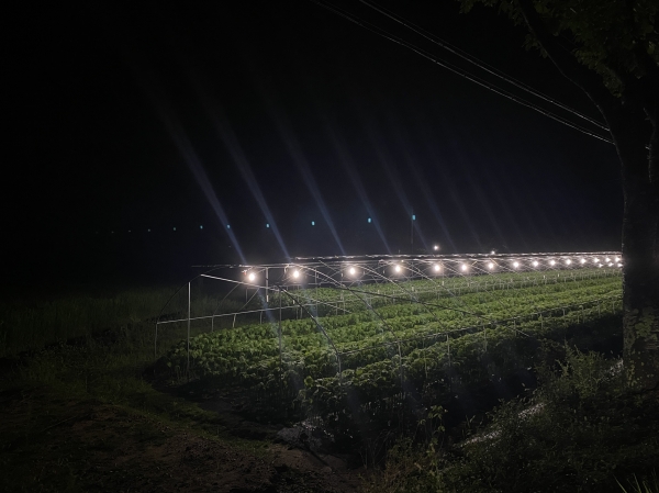 조명 광도는 25Lux 이상을 유지해야 하며 4~5평당 9W LED전구 1개를 하우스 중앙 2m 높이에 1~1.5m 간격으로 설치하고 하우스 폭이 7.5m 이상이면 2줄로 설치하는 게 좋다.