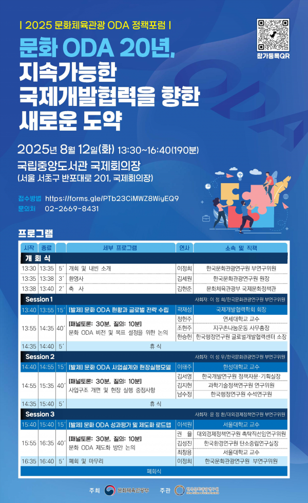 [충청25시] 문화체육관광부는 한국문화관광연구원과 함께 8월 12일 오후, 국립중앙도서관에서 문화 공적개발원조 20주년을 맞이해 ‘지속 가능한 국제개발협력을 향한 새로운 도약’을 주제로 ‘2025 문화·체육·관광 공적개발원조 정책 포럼’을 개최한다.