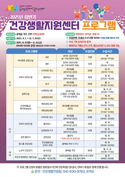 주민 호응이 높았던 ‘굿바디 보여드림’ 매트운동은 ‘건강레벨 UP 체지방 DOWN’ 이라는 이름으로 새롭게 2개 반으로 확대 운영하며 별도 신청 없이 누구나 참여할 수 있는 ‘노르딕 건강워킹’과 매주 월·목 오후 7시부터 8시까지 진행되는 야간 체조교실도 함께 운영한다.