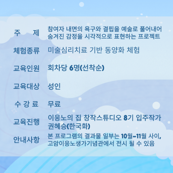 이번 프로젝트는 ‘내면의 욕구와 결핍, 예술로의 전환’을 주제로 참여자 각자의 감정과 경험을 시각적으로 표현해보는 체험 프로그램이다.