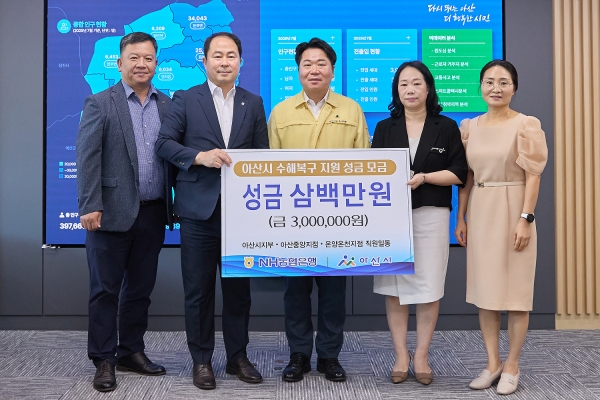 [충청25시] 아산시는 지난 8일 농협은행 아산시지부, 온양온천지점, 아산중앙지점으로부터 집중호우 피해 지역 주민들을 돕기 위해 임직원들이 모금한 성금 300만원을 전달받았다.