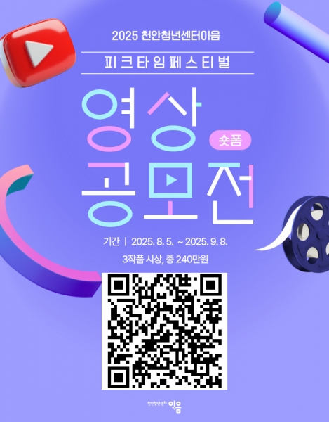 공모전은 ‘2025 청년의 날 피크타임 페스티벌’ 홍보를 주제로 한 30초~2분 미만의 쇼츠 형식의 영상 콘텐츠를 모집하며 천안시 거주 청년과 천안 소재 대학 재학생을 대상으로 진행한다.
