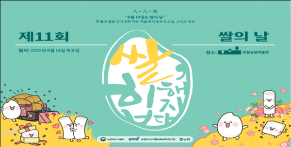 [충청25시] 농림축산식품부는 오는 8월 18일 제11회 쌀의 날을 맞아 쌀의 우수성을 알리고 쌀 중심의 식습관 확산과 쌀 소비 활성화를 위해 8월 14일에 수원 국립농업박물관에서 기념행사를 진행한다.