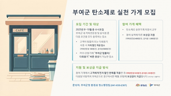 [충청25시] 부여군이 관내 커피전문점과 음식점을 대상으로 올해 10월까지 탄소제로 실천 가게를 수시 모집한다고 밝혔다.