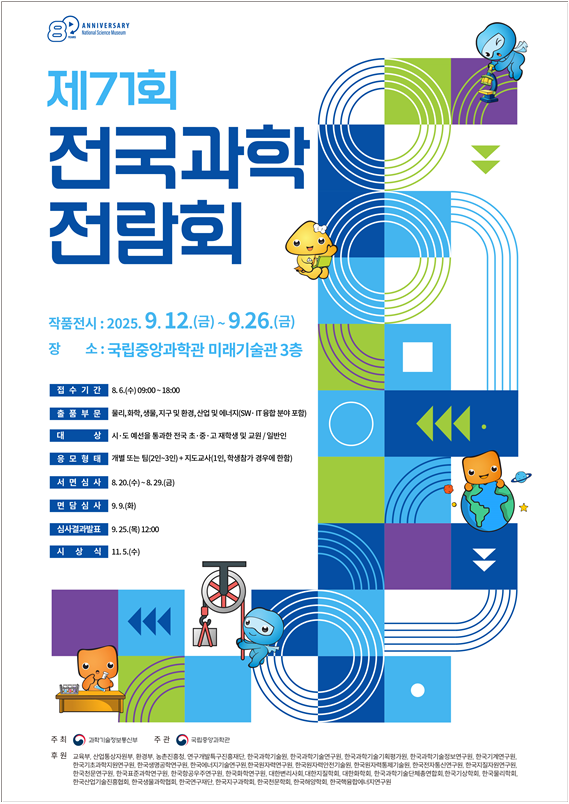 제71회 전국과학전람회는 서면심사~29일)를 시작으로 면담심사)를 통해 대통령상 2점, 국무총리상 2점 등 총 300여 점의 작품에 대한 시상을 확정할 예정이며 9월 12일부터 9월 26까지 총 15일간 국립중앙과학관 미래기술관 3층에서 전국대회 출품작 전시가 진행된다.