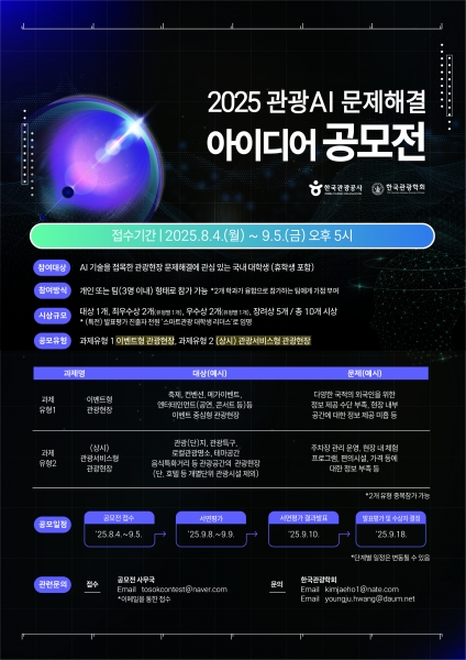 [충청25시] 한국관광공사는 한국관광학회와 함께 ‘관광AI 문제해결 아이디어 공모전’을 열고 오는 9월 5일까지 신청을 받는다.