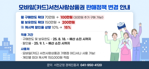 [충청25시] 서천군은 8월 18일부터 서천사랑상품권 월 구매한도를 기존 70만원에서 100만원, 보유한도는 150만원에서 200만원으로 상향한다.