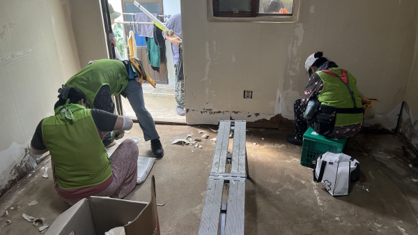 이들은 침수된 주택의 수해 쓰레기를 수거하고 젖은 장판과 벽지, 가구를 정리했으며 침수 주택의 도배장판 봉사를 진행했다.