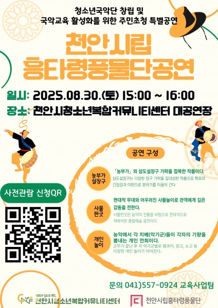 [충청25시] 천안시청소년재단 천안시청소년복합커뮤니티센터는 오는 30일 센터 대공연장에서 전통과 현대의 조화를 담은 ‘천안시립흥타령풍물단 공연’을 개최한다고 19일 밝혔다.