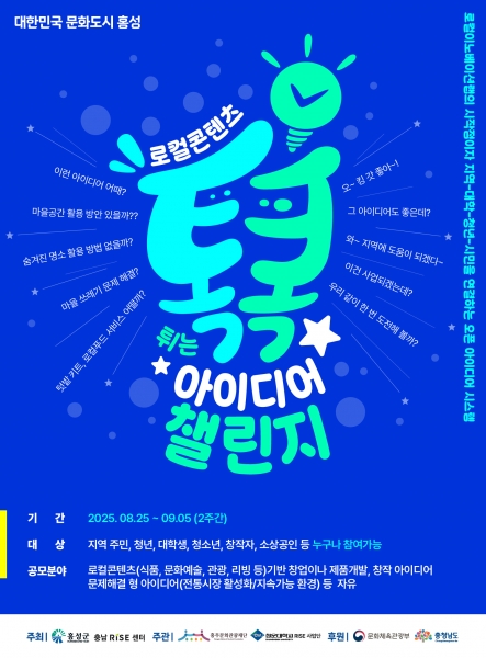 [충청25시] 홍주문화관광재단과 청운대는 오는 25일부터 9월 5일까지 2주간 ‘로컬콘텐츠 톡톡 아이디어 챌린지’를 개최한다.