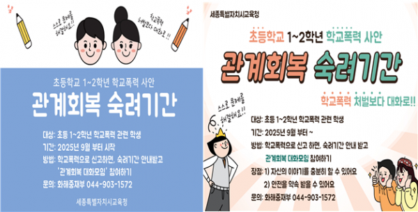 [충청25시] 세종시교육청 학교지원본부는 2025년 9월부터 관내 초등학교 1~2학년 학생을 대상으로 ‘관계회복 숙려기간’ 시범 운영을 전격 도입한다.