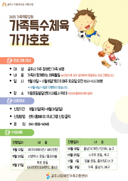 [충청25시] 공주시장애인가족지원센터는 오는 8월 21일부터 31일까지 공주시에 거주하는 장애인 가족을 대상으로 가족 체육 활동 프로그램 ‘가가호호’ 참여자를 모집한다고 20일 밝혔다.