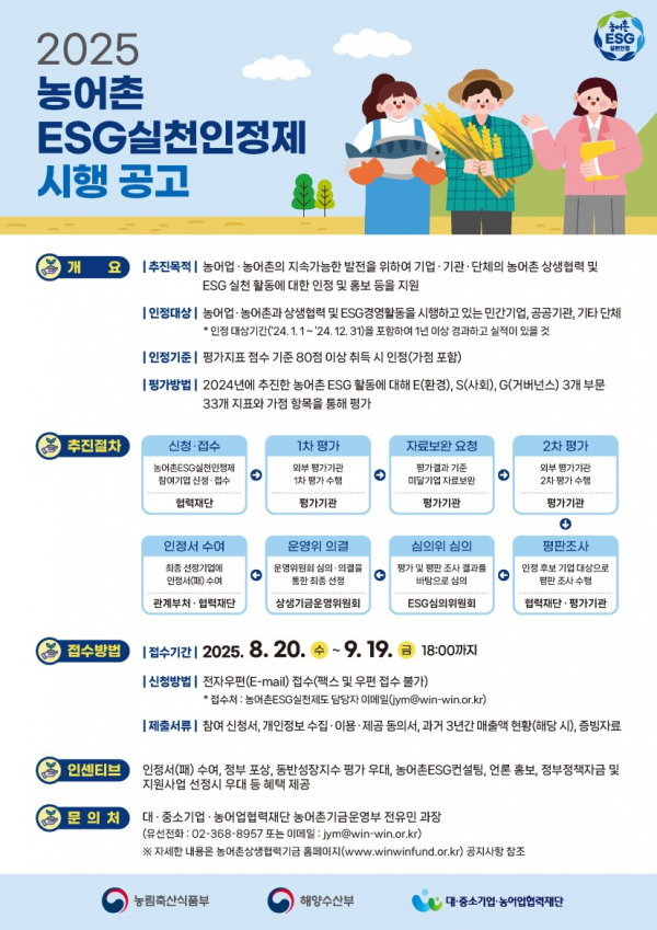 [충청25시] 해양수산부, 농림축산식품부, 대·중소기업·농어업협력재단은 농어촌 환경·사회·거버넌스 활동에 기여한 우수 기업·기관을 인정하고 홍보하기 위한 ‘2025년 농어촌 ESG 실천인정제’를 시행한다고 밝혔다.