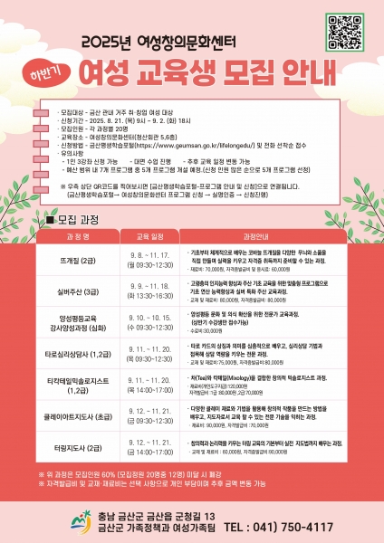 [충청25시] 금산군은 지역 여성들의 취업 역량을 강화하고 창업 기회를 확대하기 위해 2025년 하반기 취·창업 교육 프로그램을 9월부터 11월까지 여성창의문화센터에서 운영한다.