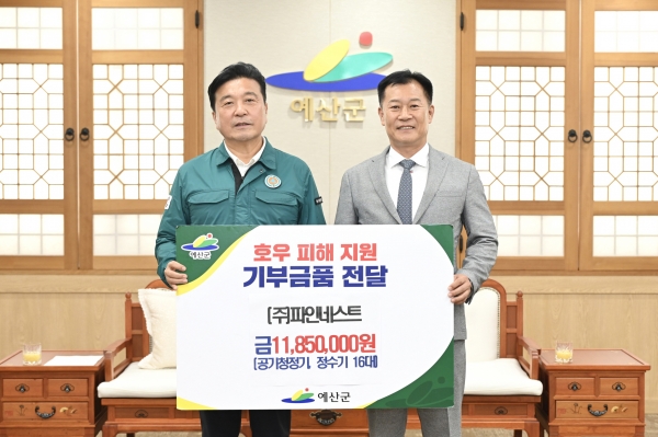 [충청25시] 예산군은 ㈜파인네스트로부터 집중호우 피해로 어려움을 겪고 있는 이재민들을 위해 1000만원 상당의 정수기와 공기청정기 총 16대를 기탁받았다고 22일 밝혔다.