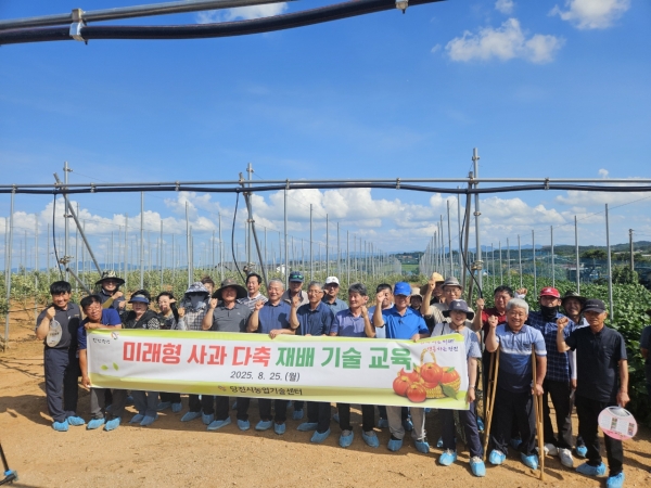 [충청25시] 당진시농업기술센터는 지난 25일 관내 사과 농가 및 희망자를 대상으로 미래형 사과 다축 재배 기술 이론 및 현장 교육을 추진했다고 26일 밝혔다.