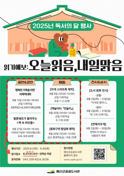 [충청25시] 예산군 공공도서관은 독서의 달을 맞아 예산 군민을 대상으로 오는 9월 2일부터 9월 30일까지 독서의 달 행사를 운영한다.