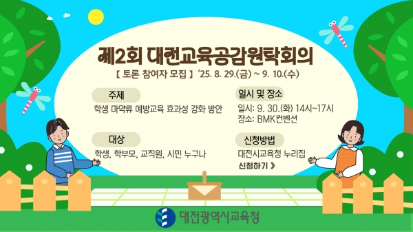 [충청25시] 대전시교육청은 9월 30일 오후 2시 BMK컨벤션에서 ‘학생 마약류 예방교육 효과성 강화 방안’ 이라는 주제로‘2025년 제2회 대전교육공감원탁회의’를 개최할 예정이며 토론회에 참여할 토론자를 모집한다고 밝혔다.