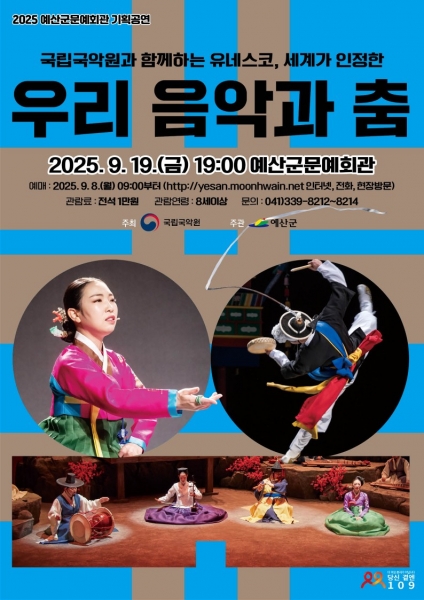 [충청25시] 예산군문예회관은 오는 9월 19일 오후 7시, ‘유네스코, 세계가 인정한 우리 음악과 춤’을 선보인다.