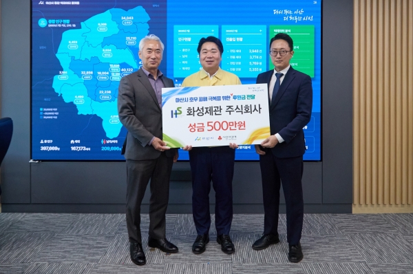 오세현 아산시장은 “어려운 시기에 지역사회를 위해 나눔을 실천해 주신 화성제관 주식회사에 깊이 감사 드린다”며 “기부하신 성금은 호우 피해 주민들의 생활 안정을 위해 소중히 사용하겠다”고 말했다.