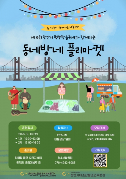 [충청25시] 천안시청소년재단 천안시태조산청소년수련관은 ‘동네방네 플리마켓’ 참가자를 선착순 모집한다고 2일 밝혔다.
