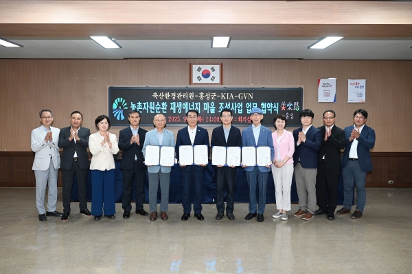 [충청25시] 홍성군는 지난 2일 홍성군청에서 기아, 축산환경관리원, 글로벌비젼네트워크와 함께 ‘농촌자원순환 재생에너지 마을 조성’ 사업 추진을 위한 업무협약을 체결하고 사업단을 공식 발족했다.