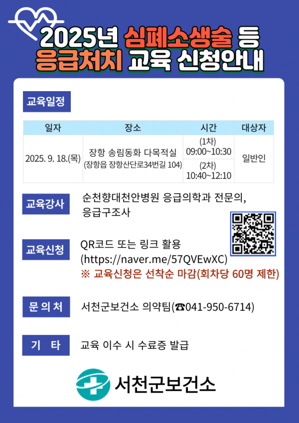 [충청25시] 서천군보건소는 군민을 대상으로 심폐소생술 등 응급처치 교육 신청자를 모집한다.
