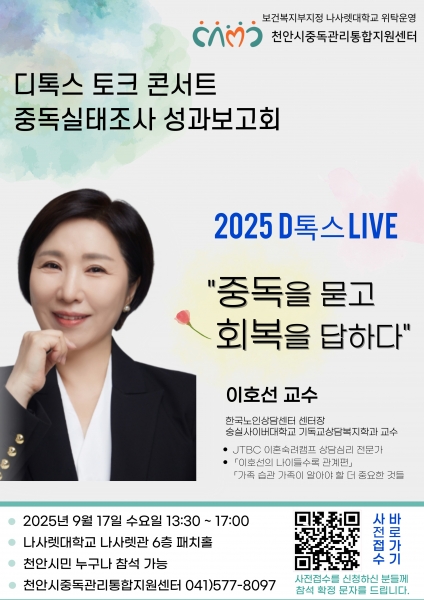 [충청25시] 천안시중독관리통합지원센터는 오는 9월 17일 ‘도박중독 추방의 날’을 맞아 나사렛대학교에서 ‘디톡스 라이브 토크콘서트’를 개최한다고 3일 밝혔다.