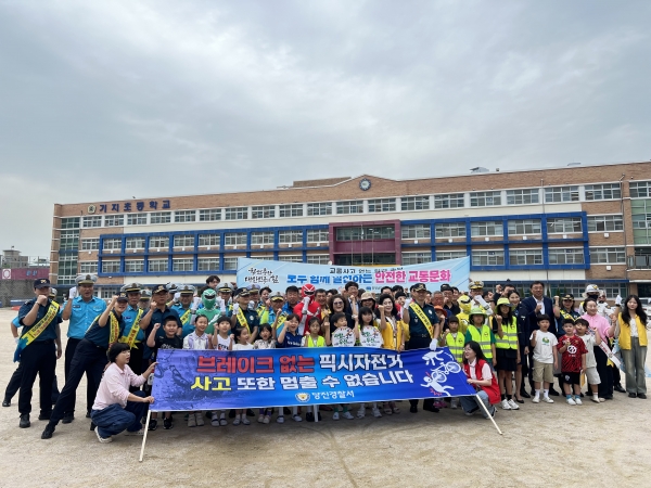 [충청25시] 당진경찰서는 9월 9일 아침 기지초등학교 등굣길에서 경찰·당진시청·당진교육지원청·충남 교통연수원·녹색어머니회·모범운전자회·당진여객·어린이레인저 등 약 120여명이 참석한 가운데 ‘유관기관 합동 등굣길 안전 캠페인’을 실시했다.
