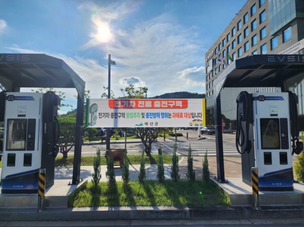 [충청25시] 예산군은 군청사 지상주차장에 전기차 충전시설 5기를 새롭게 설치하고 지난 9일부터 본격 운영에 들어갔다고 밝혔다.