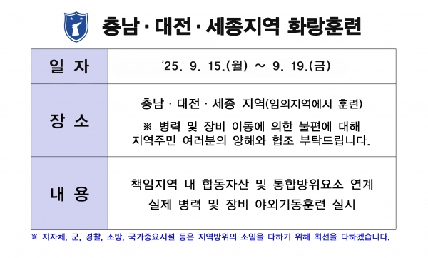 김석필 천안시장 권한대행 부시장은 “이번 훈련을 통해 통합방위작전태세를 확립하고 유사시 시민의 생명과 안전을 지킬 대응 능력을 점검할 것”이라며 “훈련 기간에는 병력과 장비 이동으로 소음과 불편이 발생할 수 있는 만큼, 훈련 상황에 당황하지 않고 협조해 주시길 바란다”고 말했다.