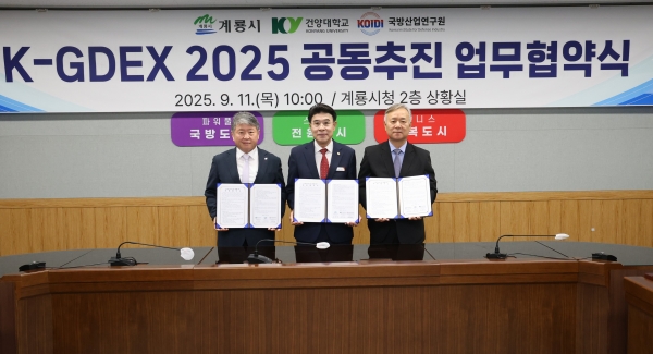 [충청25시] 계룡시·건양대학교·국방산업연구원은 11일 계룡시청 상황실에서 오는 18일부터 19일까지 유동리 종합문화체육공원에서 개최되는 ‘K-GDEX 2025, 계룡방산전시회’의 성공적인 추진을 위해 공동 업무협약을 체결하고 본격적인 준비에 돌입했다.
