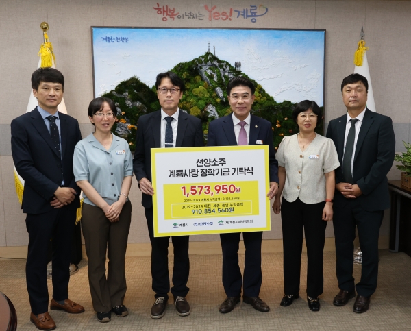 재단은 지난 11일 계룡시청에서 이응우 이사장과 강재규 영업본부장, 현지훈 남부지점장 등이 참석한 가운데 계룡軍문화축제 홍보를 위한 소주병 보조 상표 후원 물품 전달식을 가졌다.