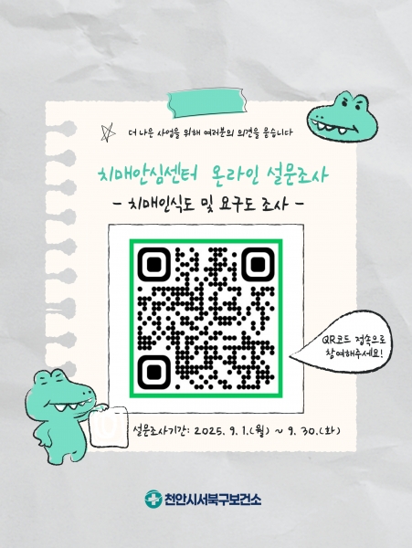 [충청25시] 천안시 서북구보건소 치매안심센터는 오는 9월 30일까지 치매 인식도 및 요구도 조사를 실시한다고 17일 밝혔다.