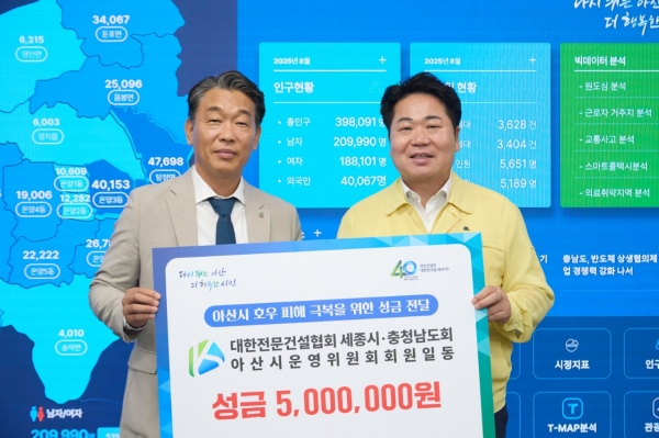 [충청25시] 아산시는 17일 대한전문건설협회 세종시⸱충청남도회와 아산시 운영위원회로부터 집중호우로 인한 피해 주민을 돕기 위해 모금한 성금 5백만원을 전달받았다고 밝혔다.