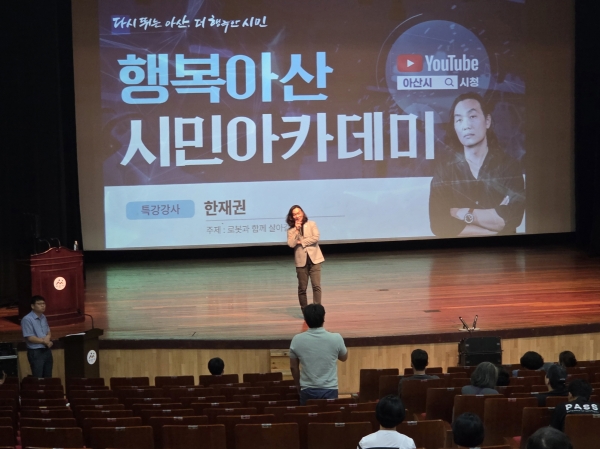 [충청25시] 아산시는 16일 평생학습관 아산아트홀에서 행복아산시민아카데미 네 번째 강연으로 한재권 한양대학교 로봇공학과 교수의 ‘로봇과 함께 살아갈 세상’을 진행했다고 밝혔다.