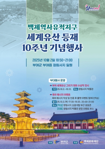 [충청25시] 부여군은 오는 10월 2일 정림사지 일원에서 백제역사유적지구 세계유산 등재 10주년 기념행사를 개최한다.
