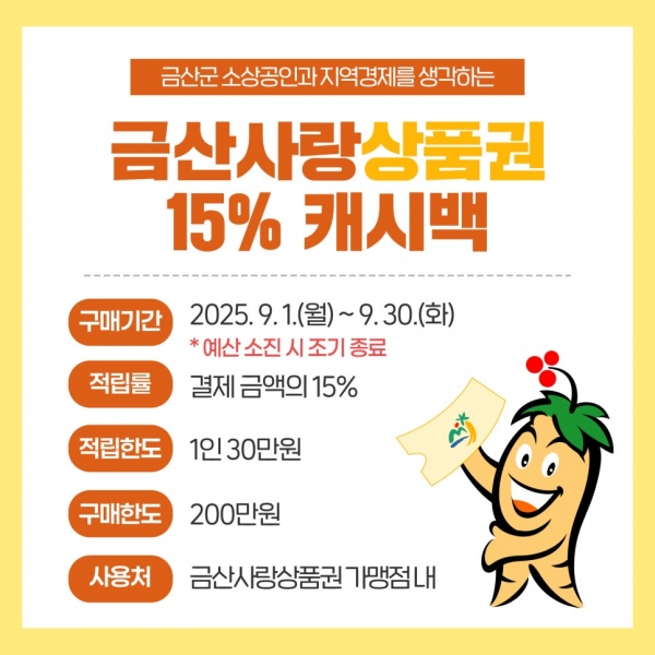 [충청25시] 금산군은 금산사랑상품권 9월 캐시백 적립률을 기존 10%에서 15%로 확대 적용하고 있다고 밝혔다.
