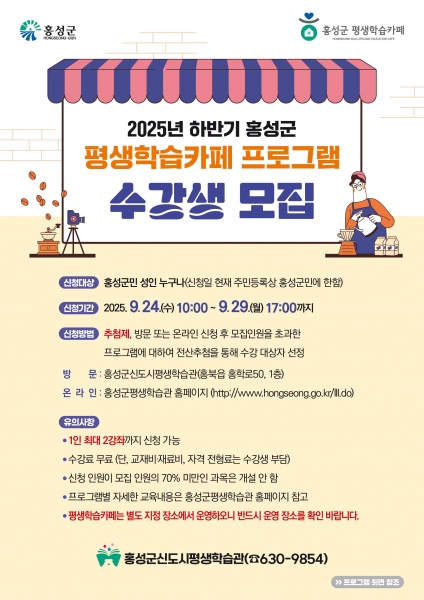[충청25시] 홍성군은 오는 24일부터 29일까지 4일간 평생학습 저변 확대를 위한 하반기 평생학습카페 프로그램 수강생을 모집한다.