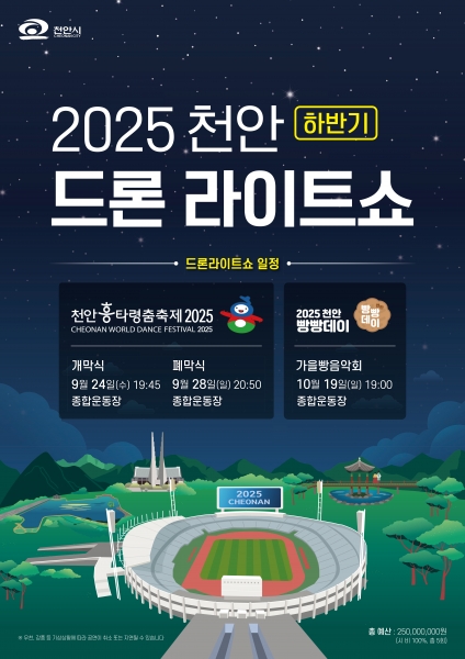 [충청25시] 천안시는 하반기 ‘2025 천안 드론라이트쇼’를 천안흥타령춤축제 2025와 2025 빵빵데이 천안에서 선보일 예정이라고 22일 밝혔다.