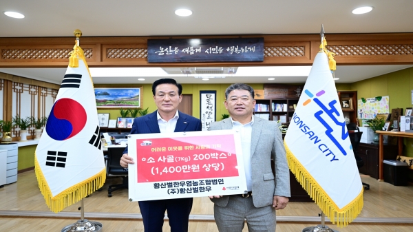 황산벌 한우영농조합법인·㈜황산벌 한우는 지역의 대표 기업으로서 매년 명절을 앞두고 꾸준히 사랑의 나눔을 실천해 오고 있어 지역사회의 귀감이 되고 있다.