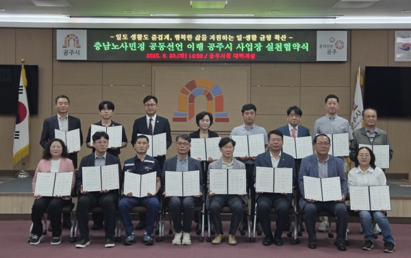 [충청25시] 공주시는 지난 23일 시청 대백제실에서 충남 노사민정 공동선언의 구체적 이행을 위한 실천 협약을 체결하고 일·생활 균형 확산에 힘을 모으기로 했다고 밝혔다.