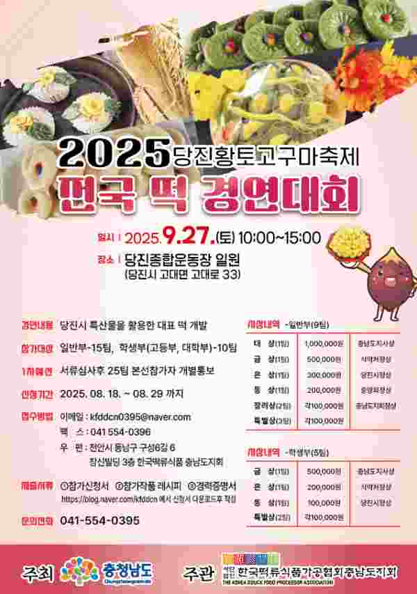 [충청25시] 당진시는 오는 27일 오전 10시 50분부터 오후 3시까지 당진종합운동장 일원에서 ‘2025년 전국 떡 경연대회’를 개최한다고 24일 밝혔다.