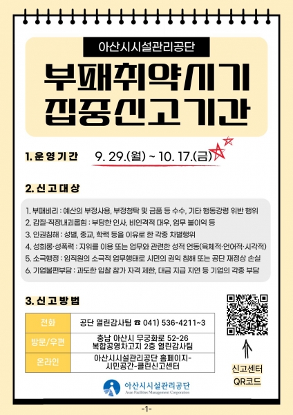 [충청25시] 아산시시설관리공단은 추석 명절을 맞아 복무기강 확립 및 청렴도 향상을 위해 오는 29일부터 10월 17일까지 부패취약시기 집중신고기간을 운영한다.