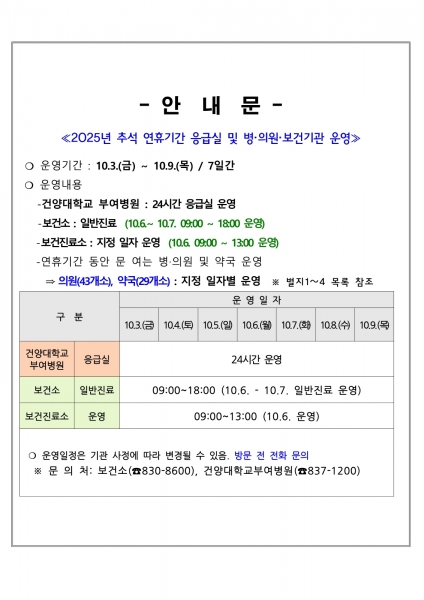 연휴 기간에는 지역응급의료기관인 건양대학교 부여병원 응급실이 24시간 운영되며 관내 병의원 43개소와 약국 29개소를 ‘문 여는 병의원과 약국’ 으로 지정·운영해 진료 공백을 최소화할 계획이다.