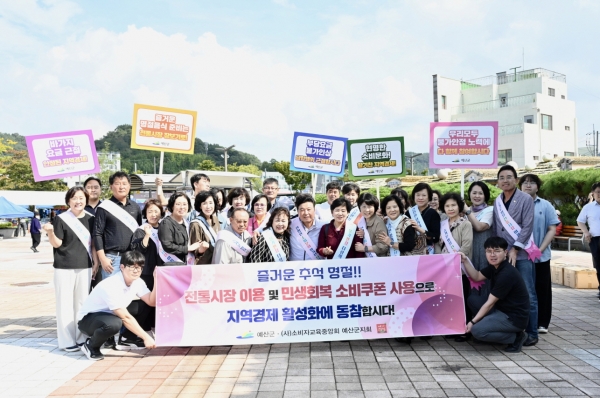[충청25시] 예산군은 추석 명절을 맞아 지난 9월 30일 예산시장에서 최재구 예산군수와 소비자교육중앙회 예산군지회 회원 등 30여명이 참석한 가운데 전통시장 장보기와 물가안정을 위한 캠페인을 전개하고 민생회복 소비쿠폰 사용을 홍보했다.