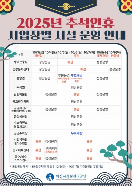 [충청25시] 아산시시설관리공단은 민족 대명절인 추석 연휴를 맞아 시민들이 안전하고 편안하게 공단 운영 시설물을 이용할 수 있도록 사업장별 운영 일정을 안내하고 연휴기간 중 안전관리에 만전을 기할 계획이다.
